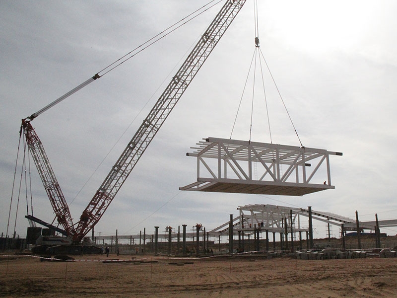包西鐵路鄂爾多斯站雨棚投影面積43000余平方米,包含天橋一座;鋼梁單跨較大跨度25米,鋼結(jié)構(gòu)用量2800多噸,工程總投資5200余萬元。該工程于2014年建成竣工,工期10個月,為車站既有線施工,施工窗口短暫,工期緊、技術(shù)要求高。當(dāng)時公司尚未成立,施工團(tuán)隊主要成員現(xiàn)在均為伸達(dá)集團(tuán)公司骨干。西北高原朔風(fēng)凜冽,彼時的伸達(dá)人不畏艱苦,與草原為伴與鋼鐵為伴,頑強拼搏刻苦攻關(guān),所在的鋼結(jié)構(gòu)施工隊工期跟的緊、技術(shù)標(biāo)準(zhǔn)執(zhí)行嚴(yán),為工程的總體竣工創(chuàng)造了條件。項目建設(shè)中,因為團(tuán)隊技術(shù)過硬,管理高 效,作風(fēng)刻苦,多次獲得工程總承包方的嘉獎。